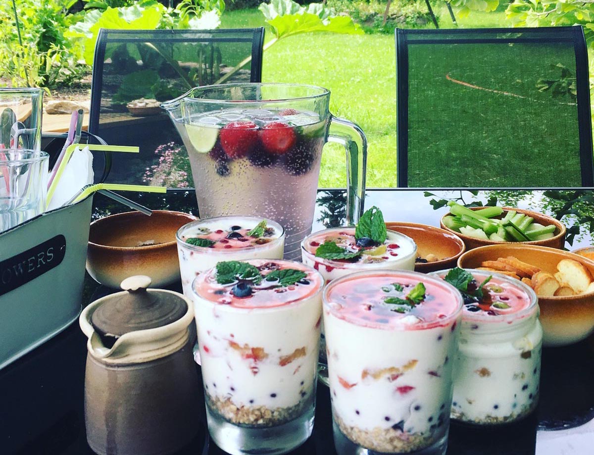 - Finish with a layer of quark and decorate it with fruit and mint.